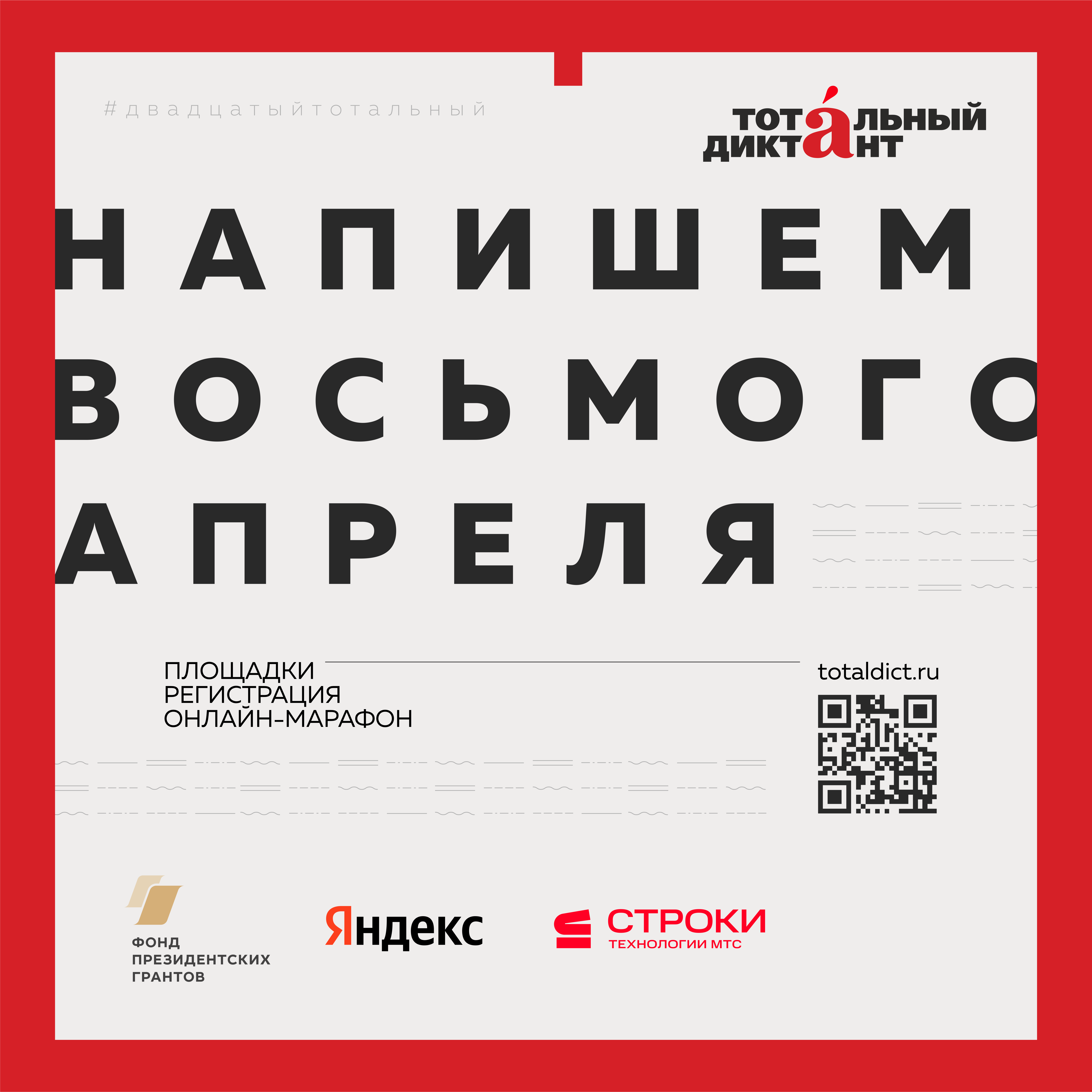 Тотальный диктант состоится в единый день – 8 апреля, в единое время – в  14:00 (с поправкой на часовые пояса) во всех субъектах Российской Федерации и за рубежом на специально подготовленных площадках. Также диктант можно написать онлайн.