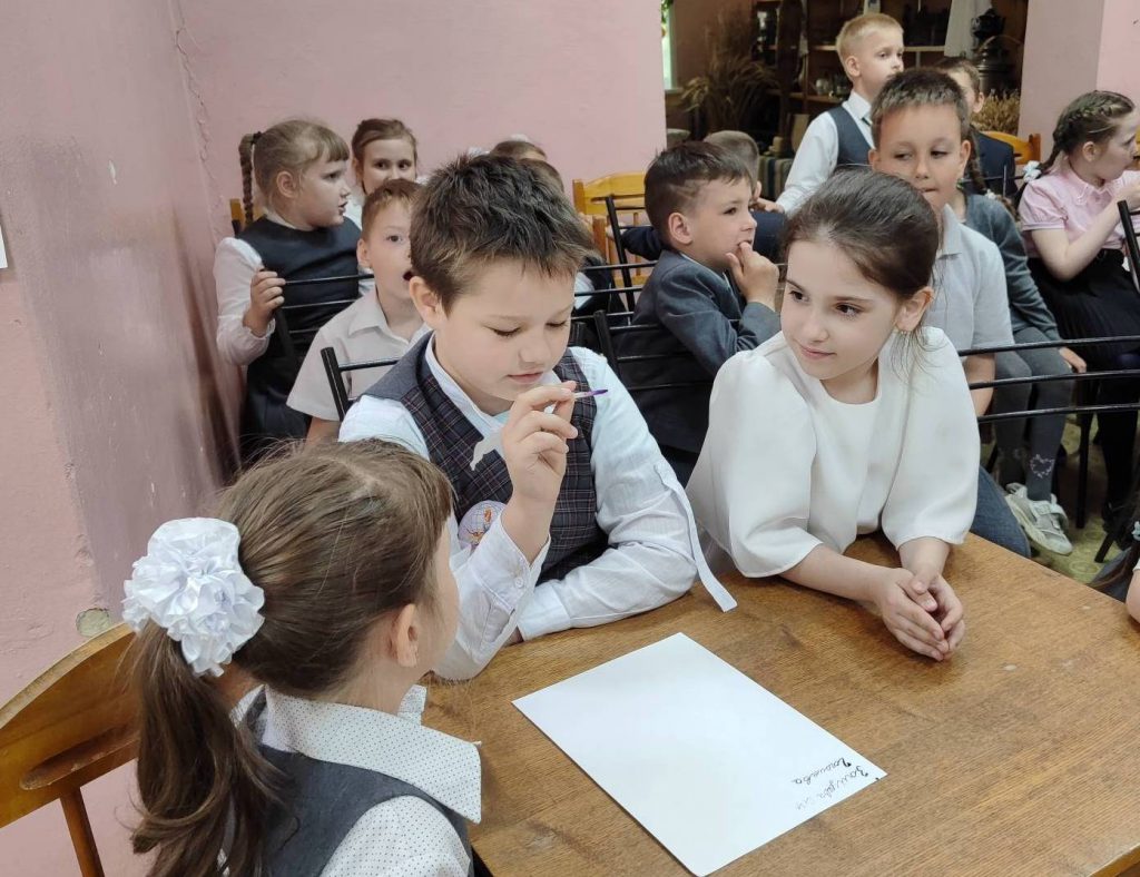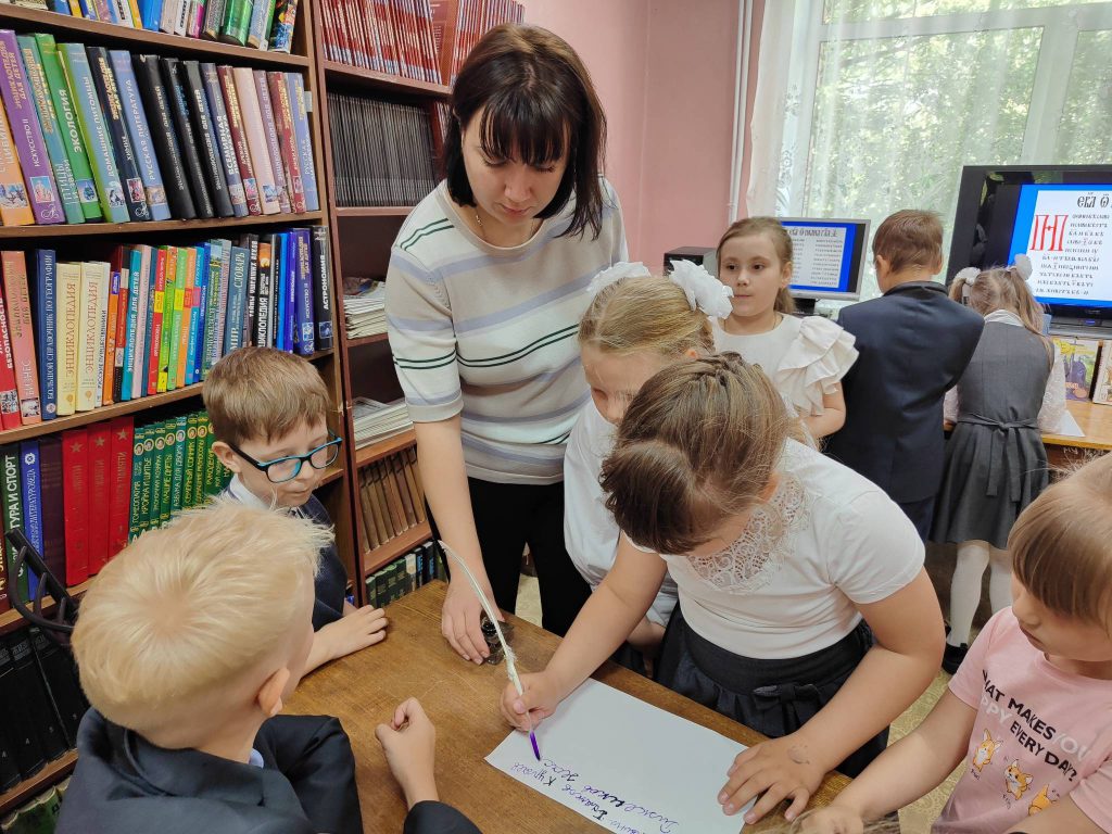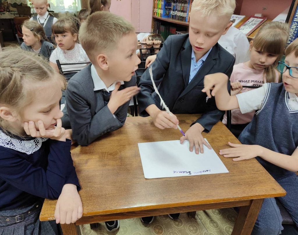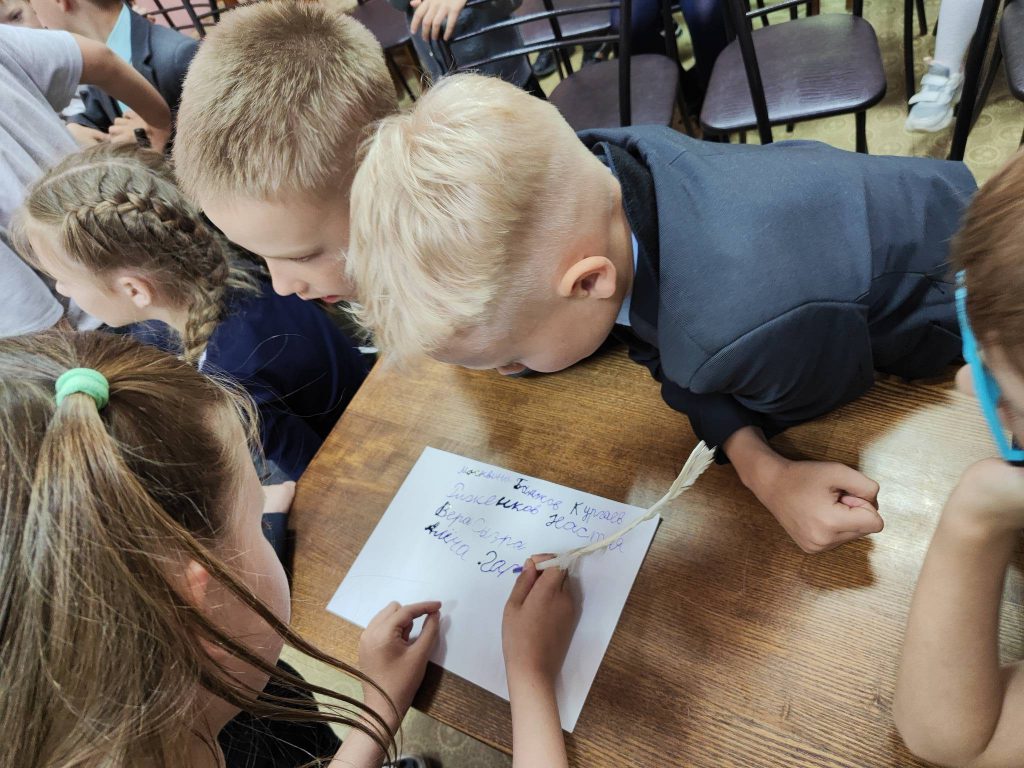 В ходе встречи школьники отгадывали ребусы, загадки, расшифровывали пиктограммы и пробовали записать пословицы с помощью рисунчатого письма. Также дети на бумаге старательно выводили свои имена чернилами, используя гусиные перья и перьевые ручки.