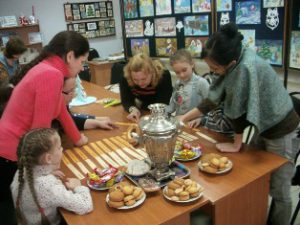Чай — один из древнейших напитков разных народов мира. Дети и родители узнали, что первые упоминания о чае встречаются в китайских рукописях, возраст которых около 5000 лет, а в Россию первые 4 пуда чайного листа привёз в подарок царю Михаилу Фёдоровичу посол от монгольского хана. За долгое время существования чая в нашей стране, сложились определенные чайные традиции, многие из которых известны до сих пор. Посмотрели на слайдах презентации, какие самовары использовались для приготовления этого ароматного напитка. Ребята с помощью взрослых вспоминали пословицы и правильно складывали две её половинки, отгадывали растения, применяемые для заваривания и их целебные свойства, называли детские книги, в которых описывается чаепитие, рассказывали, как нужно заваривать чай. Каждый ребёнок поделился секретами чайных традиций в своей семье. Душистый чай с сахаром, конфетами, печеньем, баранками, сушками и тульским пряником пришёлся по душе и детям, и взрослым.