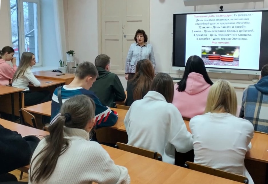 В рамках Года защитника Отечества и 80-летия Победы в Великой Отечественной войне для студентов Кузнецкого многопрофильного колледжа сотрудником центральной городской библиотеки им. А.Н. Радищева был проведён краеведческий час патриотизма «Отцов в строю сменяют сыновья…»