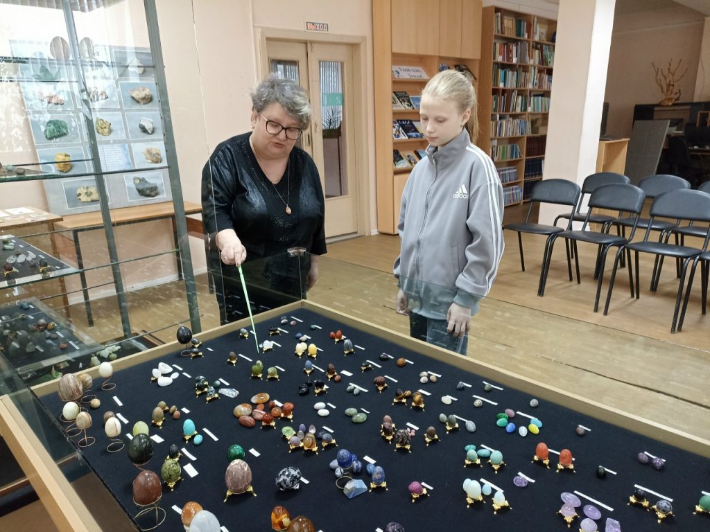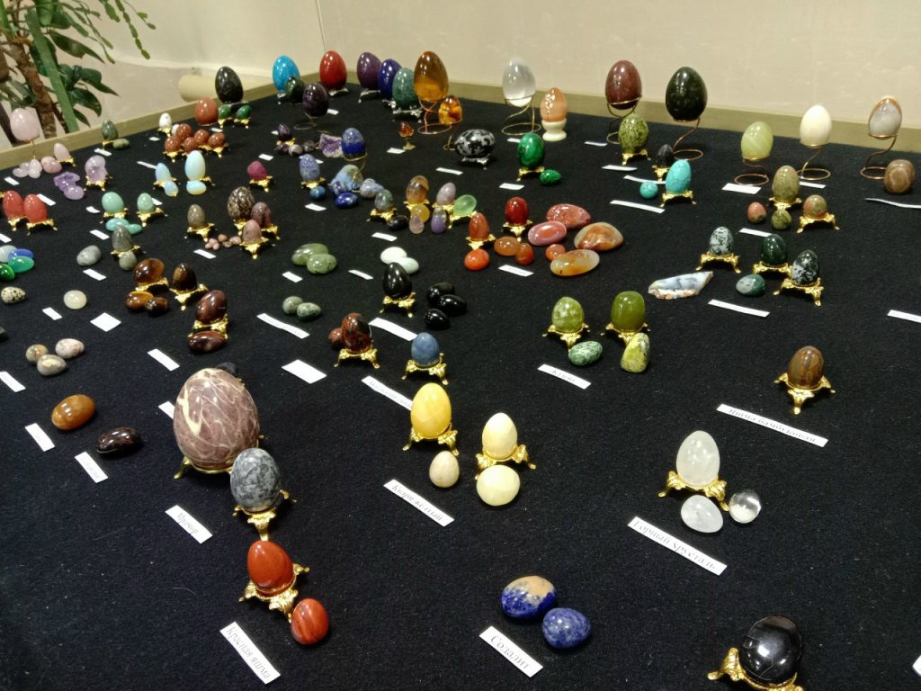 Посетители выставки узнают, как выглядят обработанные в форме миниатюрных яиц камни: лазурит, родонит, флюорит, шунгит, малахит, селенит, горный хрусталь, розовый кварц, аметист, сердолик, авантюрин, оникс, тигровый глаз, агат, яшма, змеевик… Рассказы о камнях, рождённых в недрах разных континентов планеты, расширят кругозор любознательных кузнечан. Участники экскурсий услышат древние легенды о самоцветах, поучаствуют в занимательных викторинах и геопутешествиях, вспомнят литературные произведения, связанные с «каменной» темой, познакомятся с новыми книгами о минералах и горных породах.
