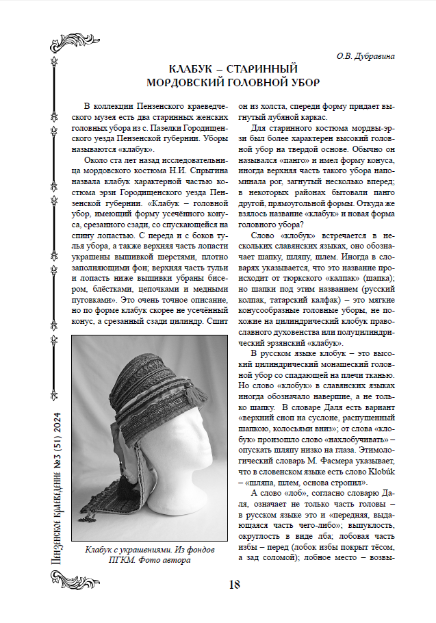 Дубравина, О.В. Клабук – старинный мордовский головной убор / О.В. Дубравина // Пензенское краеведение. – 2024. – № 3 (51). – С. 18 – 20 : 4 фото. – Свободный доступ из сети Интернет. – URL : https://disk.yandex.ru/i/J0iOHBDH4-eRCw
