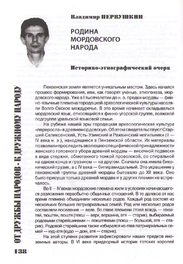 Первушкин, В.И. Родина мордовского народа : Историко-этнографический очерк // Владимир Первушкин // Сура : журнал современной литературы, культуры и общественной мысли. – 2009. – №5(93). – С. 138 – 144. : 1 фото. – (От дружбы народов – к дружному ароду). – Свободный доступ из сети Интернет. – URL : https://disk.yandex.ru/i/6s647YWb-FB-FA |