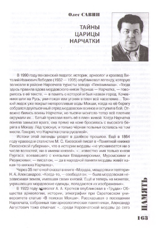Савин, О.М. Тайны царицы Нарчатки / Олег Савин // Сура : журнал современной литературы, культуры и общественной мысли. – 2009. – №2(90). – С. 163 – 168. : 1 фото. – (Память). – Свободный доступ из сети Интернет. – URL : https://disk.yandex.ru/i/Lbno6ZBMZv3OJQ |