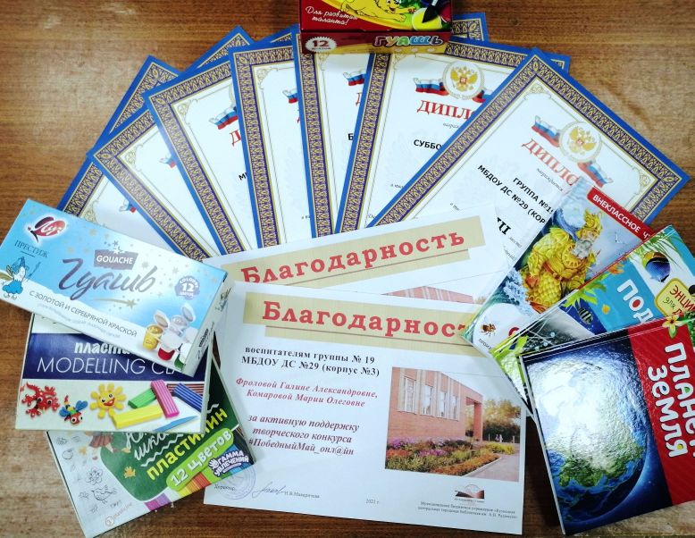 Победители конкурса #ПобедныйМай_онл@йн награждены дипломами и памятными подарками. За большую работу по патриотическому воспитанию подрастающего поколения благодарственными письмами отмечены воспитатели и педагоги дополнительного образования.