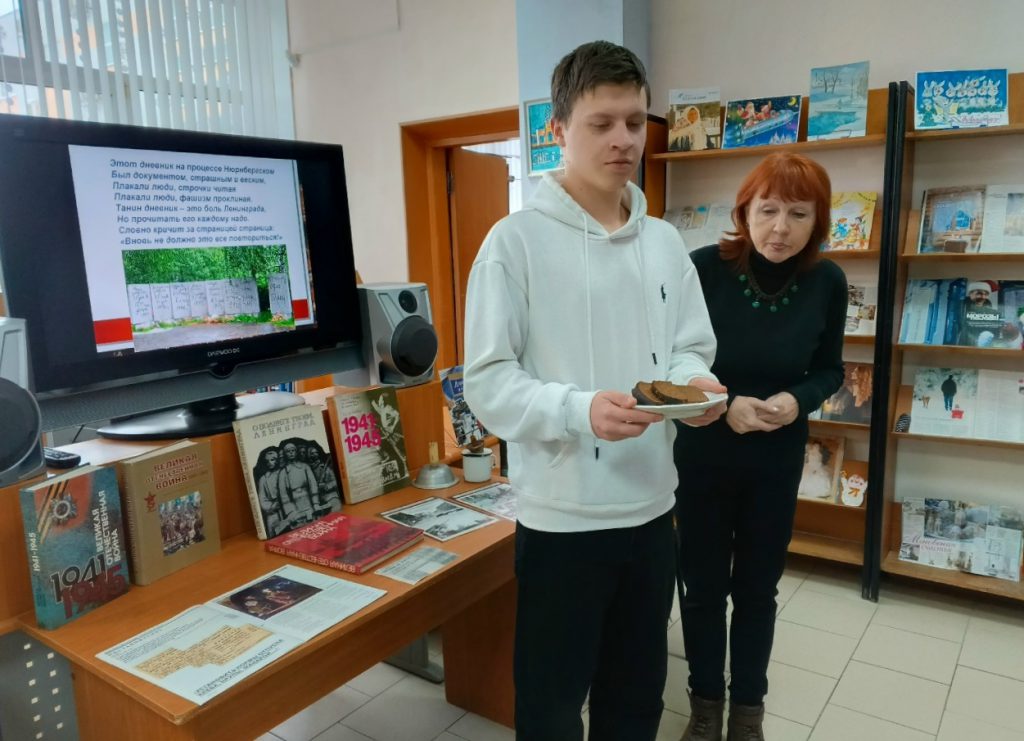 8 сентября 1941 года стало черной датой – Ленинград оказался в кольце вражеских войск. Начались 900 дней и ночей, наполненных ужасом, голодом и холодом. Особое внимание библиотекари уделили зиме 1941-1942 годов – самой тяжелой и скорбной в истории города. Юноши смогли увидеть и взять в руки символ блокадного Ленинграда — кусочек черного хлеба весом всего в 125 граммов.