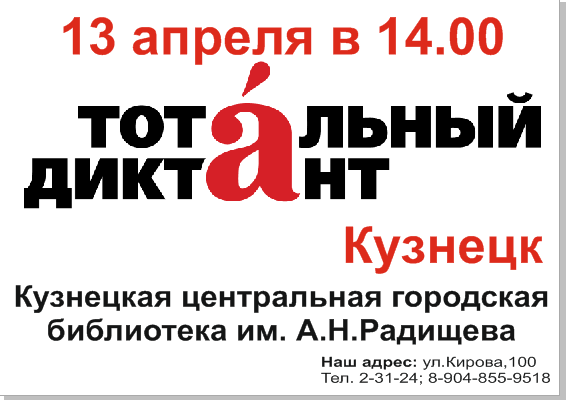Внимание! Проводится предварительная регистрация лиц, желающих принять участие в Тотальном диктанте. Количество мест на площадке в центральной городской библиотеке им. А.Н. Радищева ограничено!