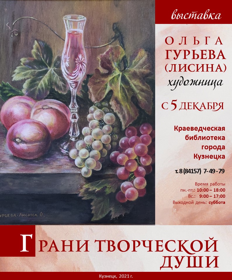 Ольга Борисовна с детства любила рисовать. Её картины проникнуты любовью к природе, близким людям. Она не только рисует, но и пишет стихи. О.Б. Гурьева награждена медалью «Анна Ахматова 130 лет» как номинант национальной литературной премии «Поэт года 2019». Ольга Борисовна – номинант конкурса «Георгиевская лента», кузнечанка была награждена медалью «Георгиевская лента 250 лет».