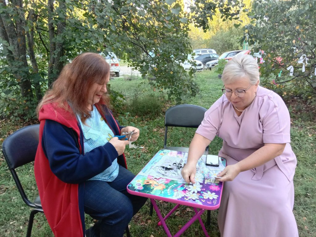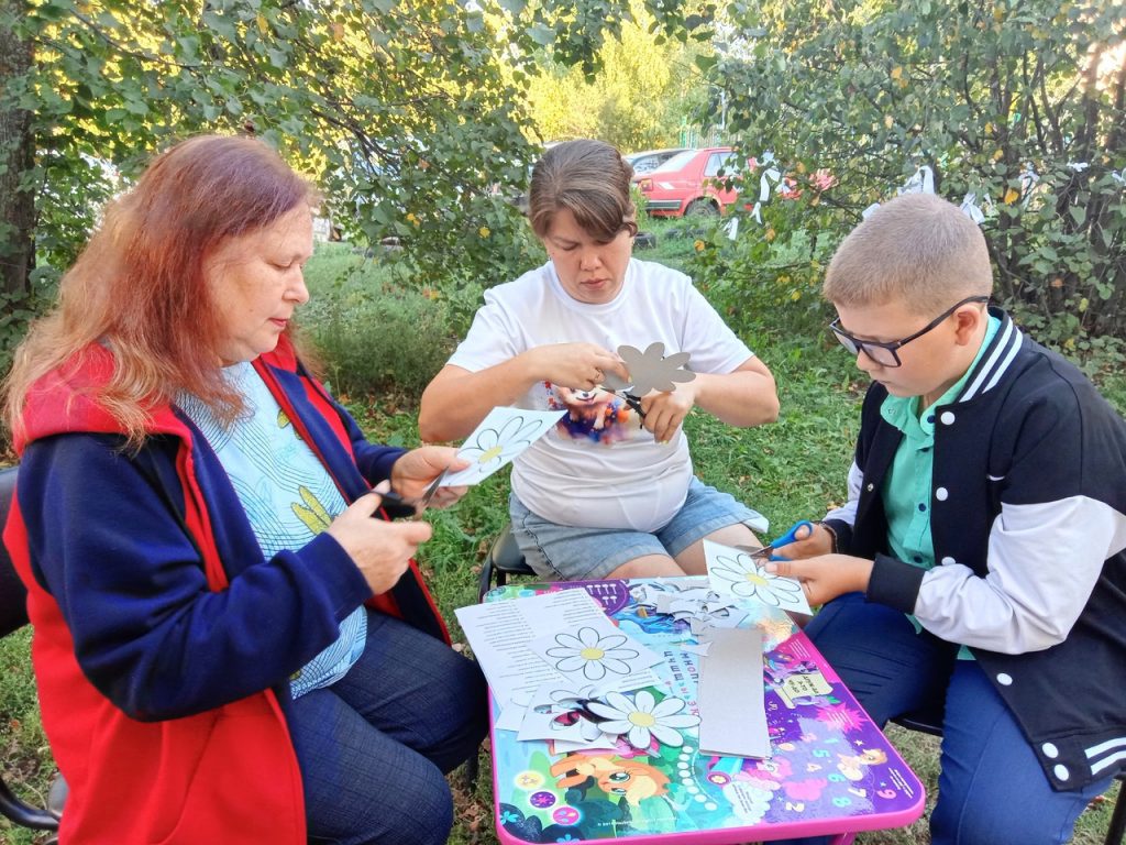 Сотрудники библиотеки-экоцентра в клубе на воздухе «Западный» провели мастер-класс по изготовлению ромашки с пожеланиями для участников СВО в рамках праздничной программы «Марафон семейного успеха», организованной творческим центром «Родина».