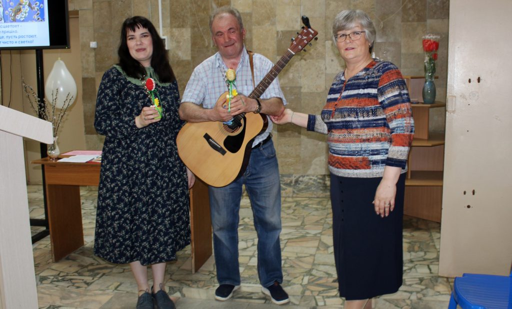 Продолжилась встреча выступлением гостей, впервые пришедших в «Гармонию». Это выступление перед большой аудиторией стало дебютом для регента хора храма Святителя Николая из Зеленого Шума Агаповой Марины и певчего Гладкова Валерия. В их выступлении прозвучали духовные, светские и бардовские песни. Никого не оставили равнодушными музыкальные композиции военных лет. Но особенно пронзительными были две песни. Одна написана на стихи участника СВО с позывным «Лавр». Другая — матерью одного из погибших участников спецоперации. Искренними, горячими аплодисментами отвечали собравшиеся на каждое исполнение гостей.