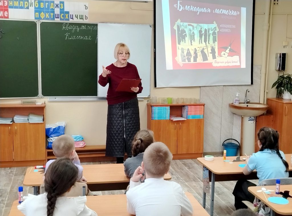Особое внимание школьников было уделено «блокадной ласточке», которая является символом героизма ленинградцев. Девочки и мальчики узнали, что мужественные ленинградцы носили на одежде маленький жестяной значок с изображением ласточки с письмом в клюве, который воодушевлял их в самые тяжёлые моменты блокады и помогал надеяться на мирное время.
