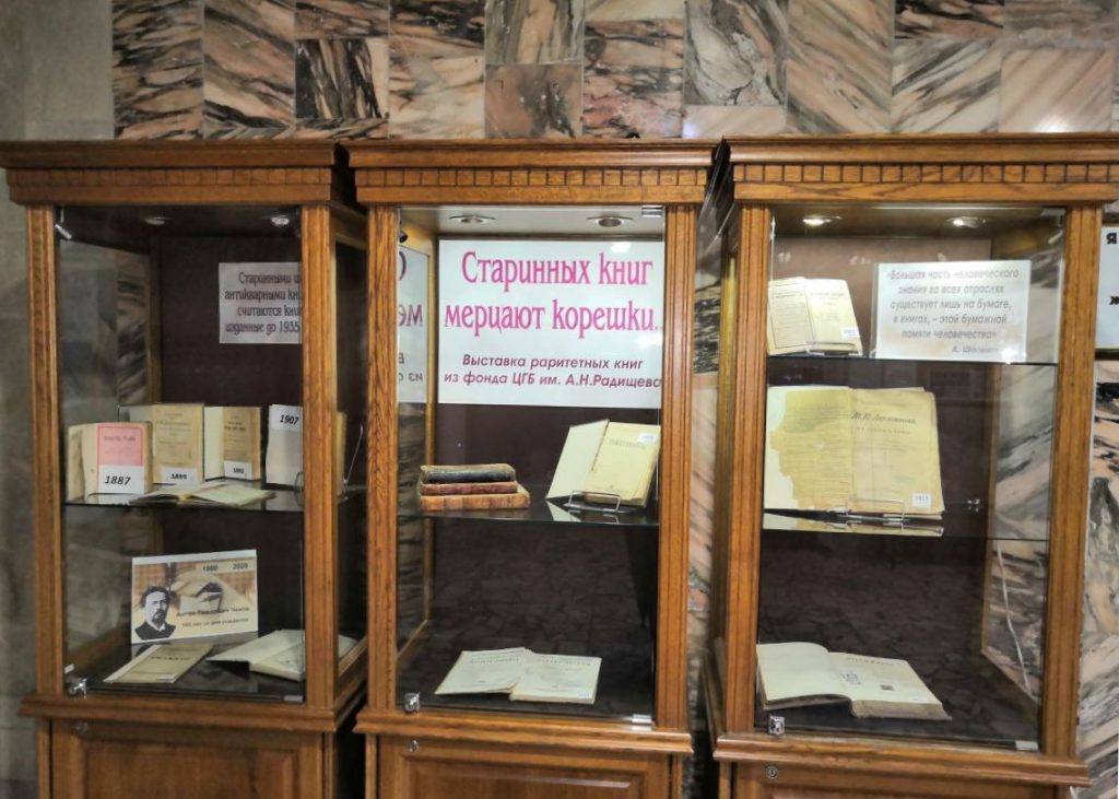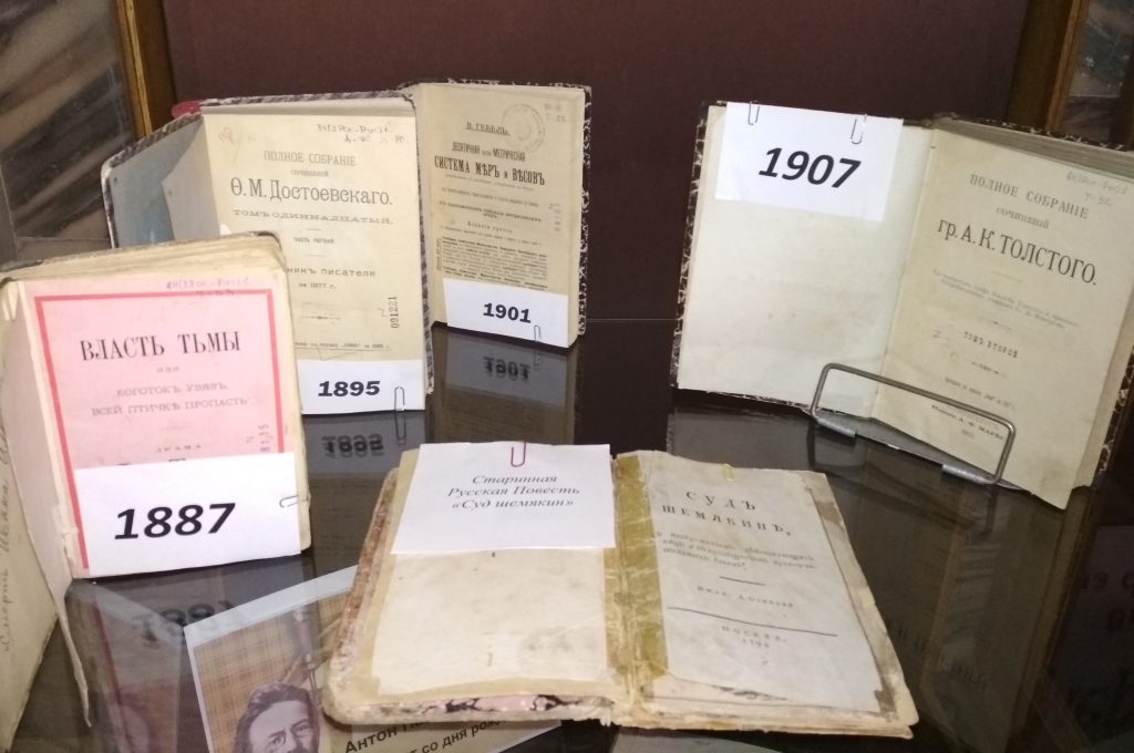 Вот некоторые названия книг, представленных на выставке: старинная русская повесть «Суд Шемякин» 1794 года издания; В. Гебель «Десятичная или метрическая система мер и весов» 1901 года издания; А.П. Чехов «Неизданные письма» 1930 года издания и другие.