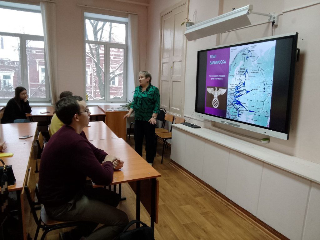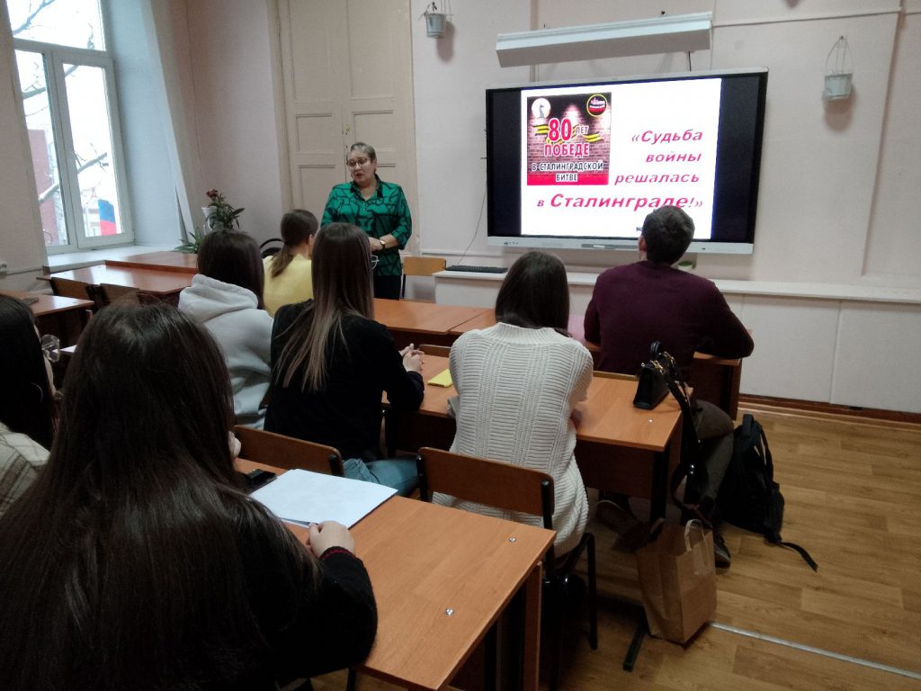 Сотрудники центральной библиотеки им. А.Н. Радищева провели для студентов Кузнецкого многопрофильного колледжа час мужества «Судьба войны решалась в Сталинграде». Студентам рассказали о событиях, которые происходили в полуразрушенном Сталинграде в 1942–1943 годах, как был подготовлен и осуществлён разгром гитлеровских войск на Волге, а также о героизме и мужестве советских людей, сделавших всё, чтобы Сталинградская битва стала началом Великой Победы.