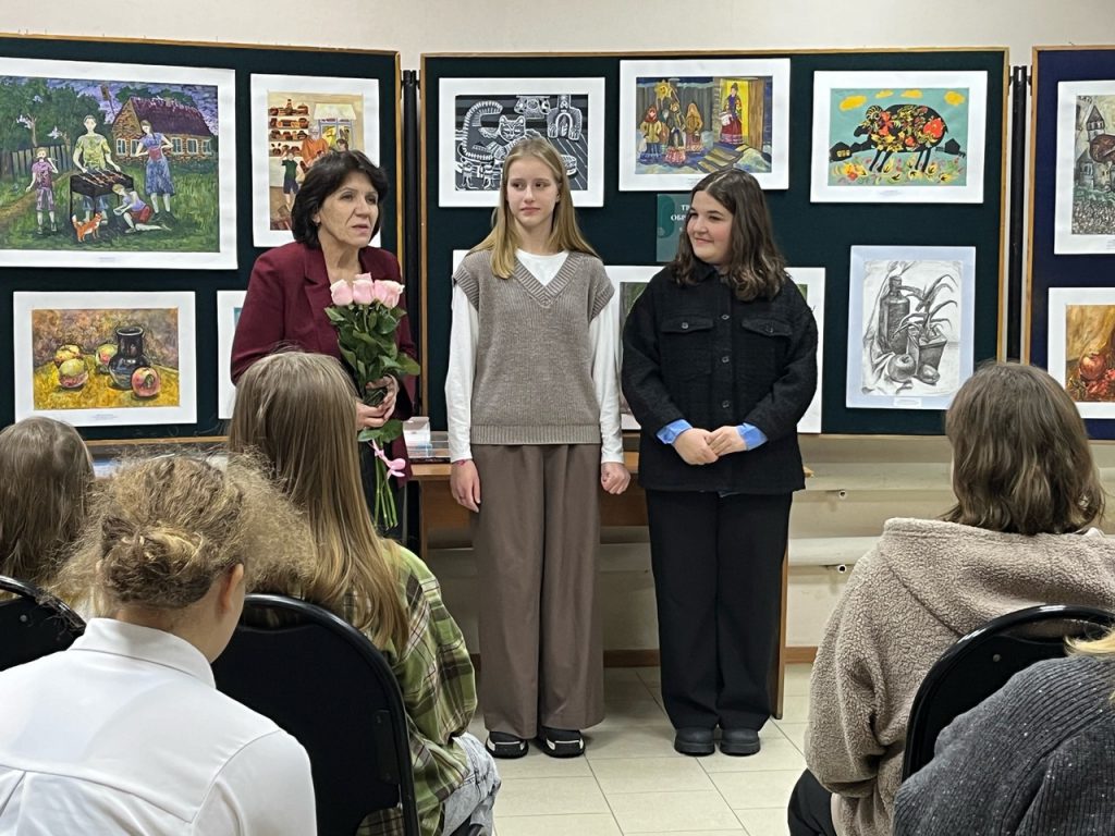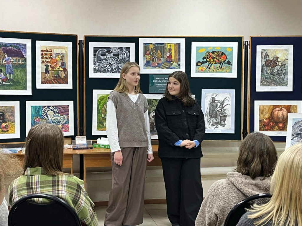 Директор школы № 17 Наталья Владимировна Гаранина задавала много интересных вопросов художницам, которые помогли глубже понять внутренний мир Елизаветы и Русланы. Елизавета – победитель конкурса «Большая перемена», за свои творческие достижения четыре раза получала путевки в Международный детский центр «Артек». Руслана –  победитель международных, всероссийских и областных творческих конкурсов.