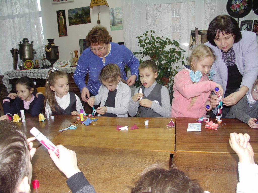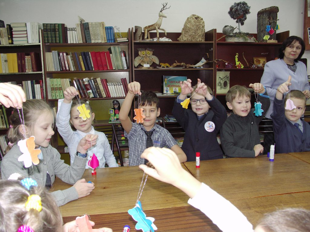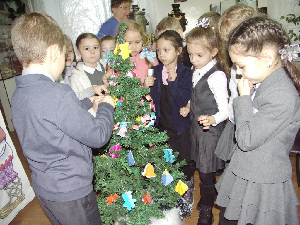 Школьникам раздали заготовки из бумаги в виде колокольчиков, мишек, фонариков. Дети склеили стороны заготовок, и получились объёмные елочные игрушки. А первоклассники затем сделали общую гирлянду из бумажных разноцветных колечек. Когда гирлянда была готова, ребята украсили зелёную красавицу.