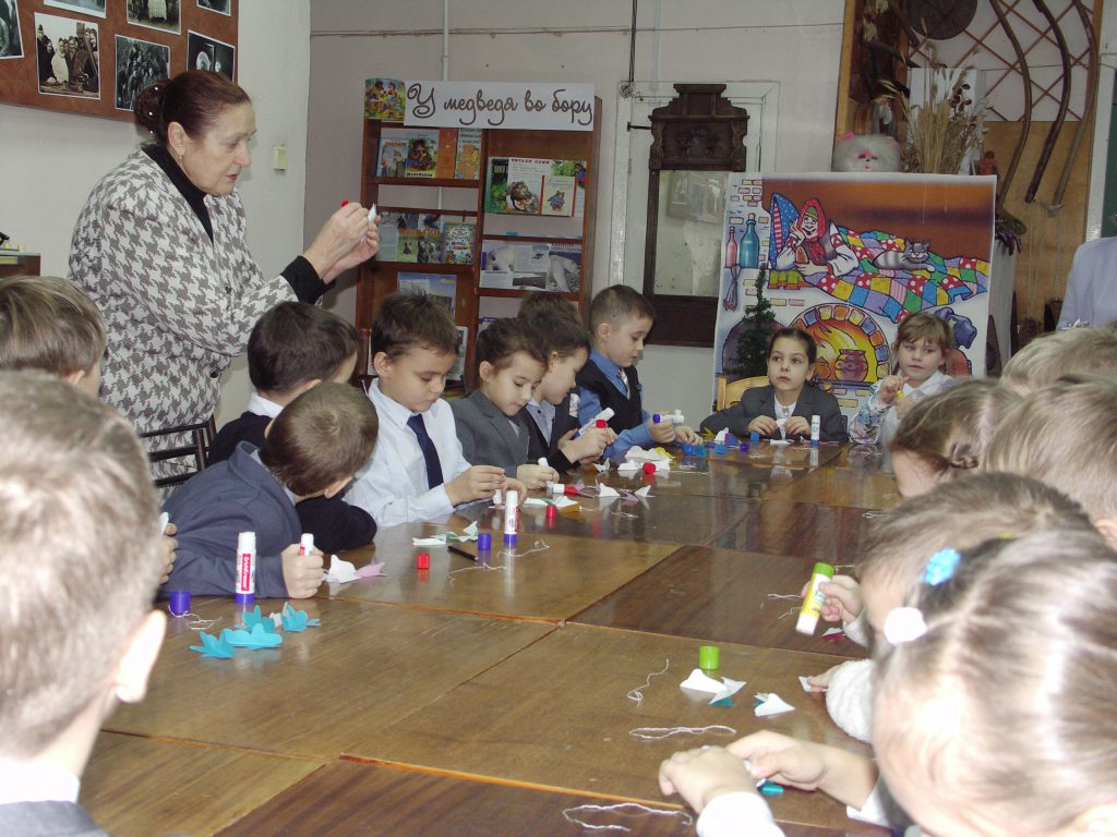Библиотекари рассказали первоклассникам о том, как украшали новогоднюю ёлку в начале ХХ века. Детям предложили нарядить ёлку игрушками, сделанными своими руками.