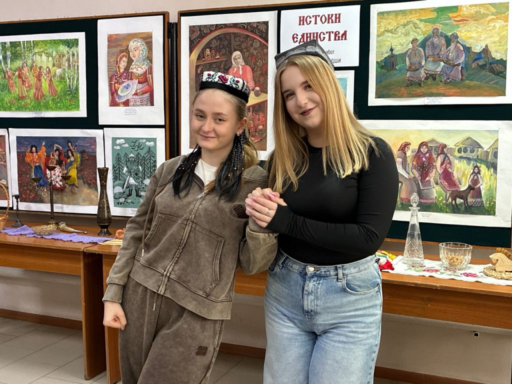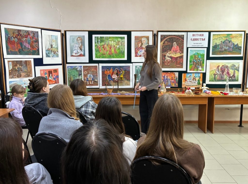 В юношеской библиотеке в рамках акции открылась выставка «Истоки единства», представляющая работы учащихся детской художественной школы и школы искусств. Первыми посетителями выставки стали студенты многопрофильного колледжа — будущие педагоги. На полотнах юных художников ожили традиции разных народов России: троицкий хоровод, масленичные гулянья, пасхальный стол и Курбан-байрам, осетинская свадьба и кавказская лезгинка. Отдельное место заняли образы ремесленников — гончаров, кузнецов, вышивальщиц. Гости не только любовались работами, но и разгадывали пословицы народов России и загадки из «чёрного ящика». Завершилась встреча масленичным чаепитием с блинами разных национальных кухонь — мордовскими пачат, татарскими тэбикмэк и кубанскими блинами.