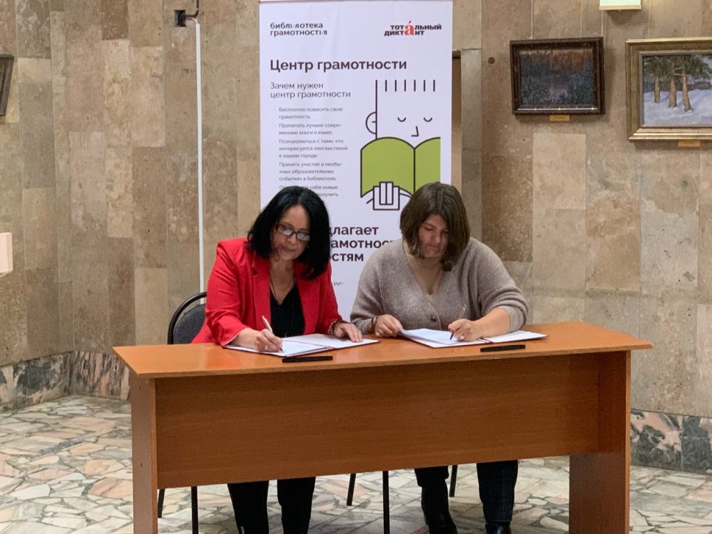 Ключевым событием праздника стала торжественная церемония подписания соглашения о сотрудничестве между фондом поддержки языковой культуры граждан «Тотальный диктант» в лице директора фонда Ольги Ребковец и директора библиотеки Натальи Макаричевой.