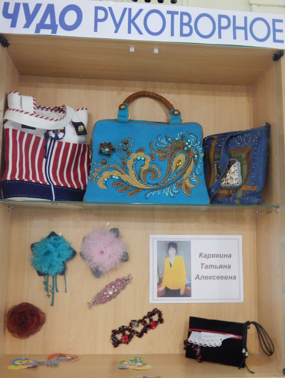 В небольшой экспозиции можно увидеть сумки из ткани, сшитые руками мастерицы. Cамодельными сумками сегодня мало кого удивишь. Но изделия Татьяны Александровны достойны внимания и восхищения, ведь они украшены тесьмой и вышивкой, бисером и поделочными камнями. Однако на этих, важных для каждой представительницы прекрасного пола изделиях, нет ничего лишнего. Всё не только красиво, но и изысканно и гармонично вплетено в украшение изделия. Эти сумки могут носить и утончённые леди, и тинейджеры.