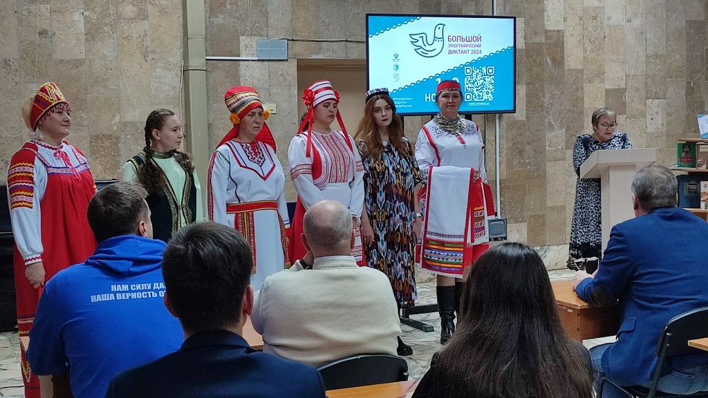 Перед написанием диктанта библиотекари рассказали и показали костюмы разных национальностей, населяющих Россию. Кроме этого, площадка в библиотеке была уникальна тем, что её модератором является победитель конкурса «Предложи свой вопрос».