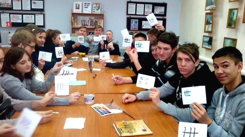 В практической части программы разгадывали кроссворд «Что мы знаем о Японии», определяли эмблемы марок известных японских автомобилей. Узнали секреты составления цветочных композиций – икебаны. В заключение каждый из студентов попробовал себя в искусстве японской каллиграфии Сёдо (shodo) — «путь письма». Во время мастер-класса студенты кистью и красками написали иероглиф «Мир Свет Жизнь».
