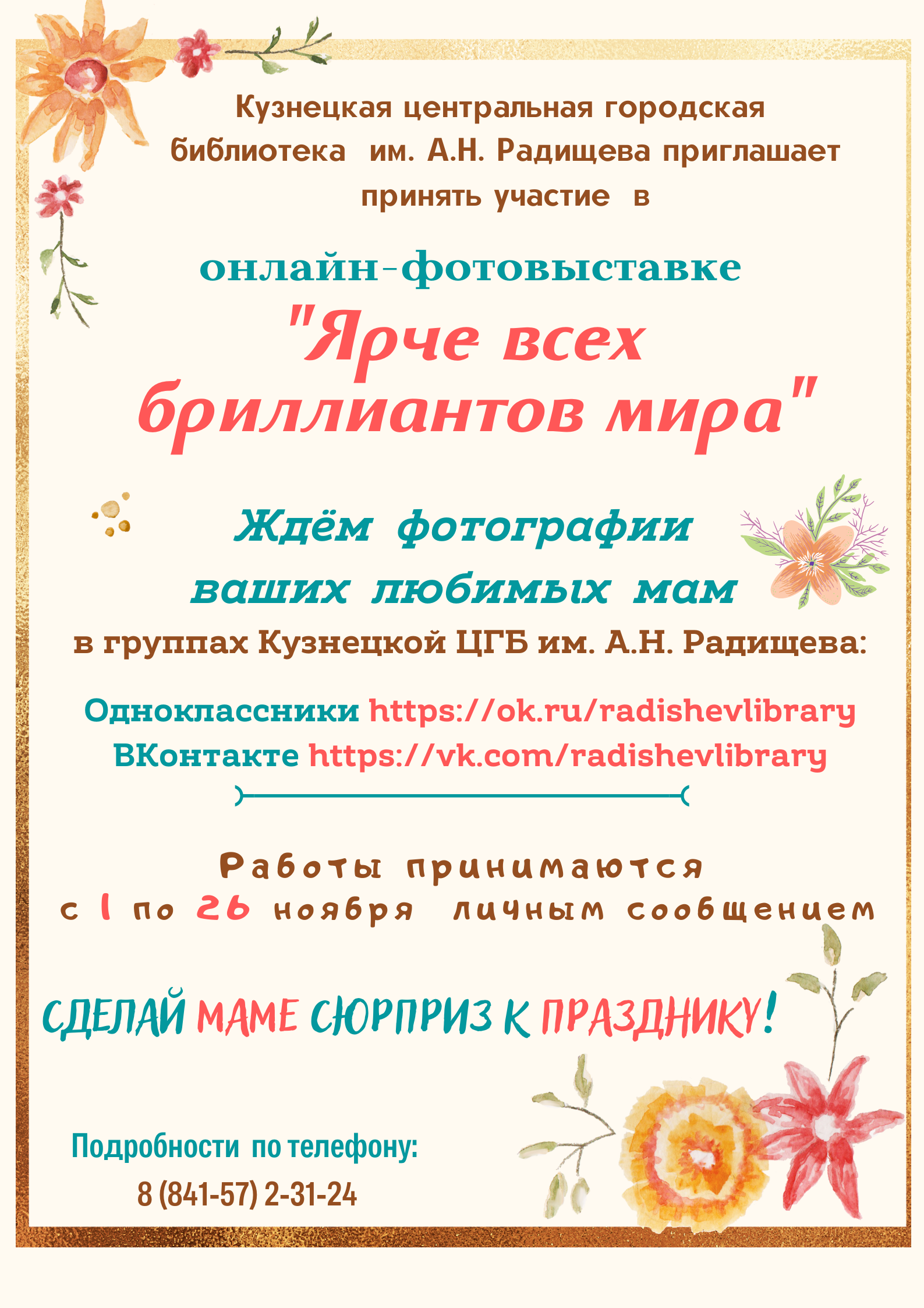 С 1 по 26 ноября в соцсетях Кузнецкой центральной городской библиотеки им. А.Н. Радищева будет проходить онлайн-фотовыставка «Ярче всех бриллиантов мира», посвящённая Дню матери.