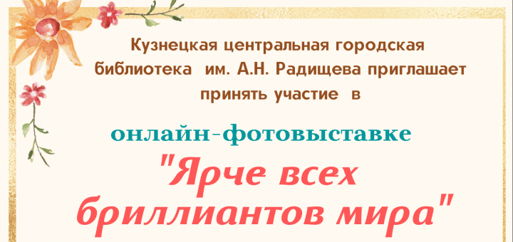 С 1 по 26 ноября в соцсетях Кузнецкой центральной городской библиотеки им. А.Н. Радищева будет проходить онлайн-фотовыставка «Ярче всех бриллиантов мира», посвящённая Дню матери. В фотовыставке могут участвовать все желающие, необходимо лишь личным сообщением прислать красивую...